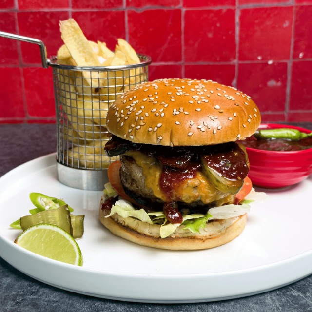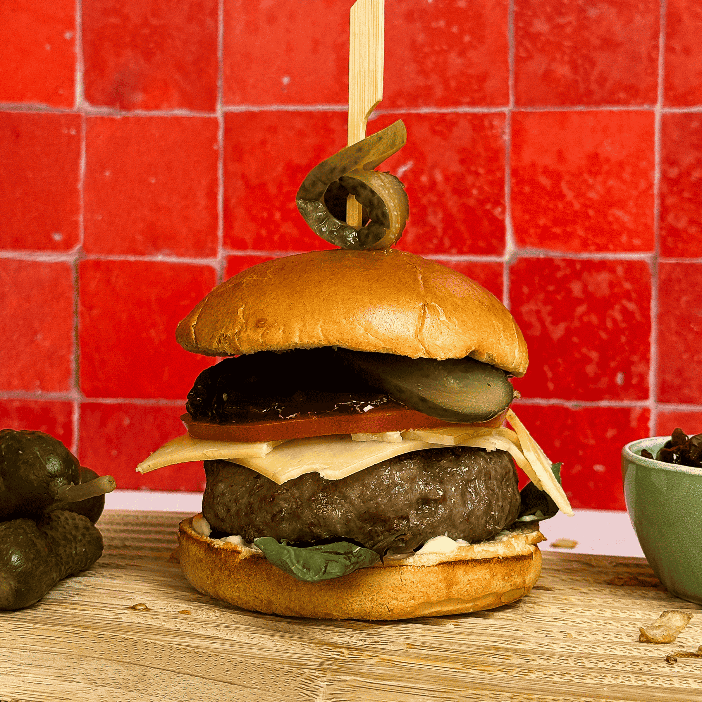 Juicy beef burger with smoked Cheddar, rocket, Blenders Real Mayonnaise and Red Onion Relish in a toasted brioche bun.