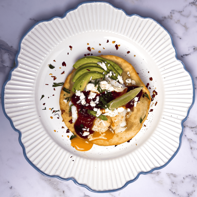 Crisp tostadas with beans, eggs, cheese and Blenders Sweet Tomato Relish, topped with sour cream, avocado and coriander.